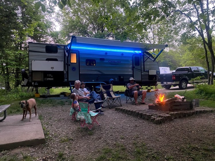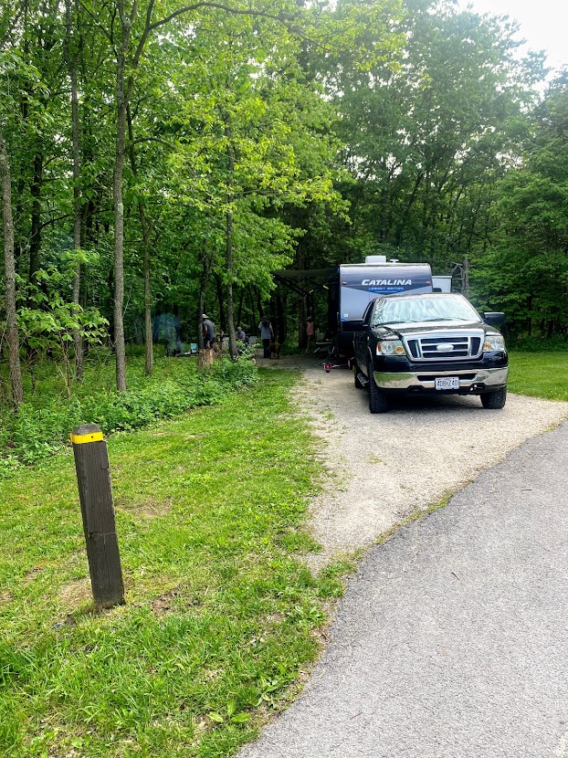 Located in Wildwood, Missouri, the campground at Cuivre River is a large campground with 3 sections – Basic, Electric, and Full Hook Up. The basic section offers a few platform tent sites with the tents during the on-season. You can still use the platforms during the off-season if you supply your own tent. The sites in the basic and electric sections are definitely more wooded whereas the FHUs have almost no shade. Our favorite is site 15 because it literally backs into the woods. There is only one showerhouse/bathhouse in the campground and it is located between the basic and electric sections. During the off-season, there is only one vault toilet available for the whole campground. The roads are wide and well-maintained making them great for biking/scootering/skating. The check-in station also serves as a small store, and there is a lending library at the showerhouse. The only two “issues” we have encountered during our trips there are 1. Ticks are so bad, and 2. There is a dog from a neighboring house that frequents the park. He is a nice dog (and beautiful) BUT he is a nuisance and the park is having a hard time keeping him out.